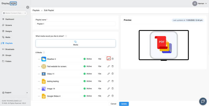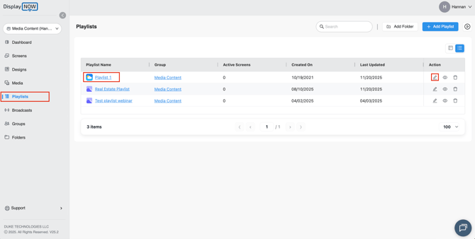 - Select the playlist containing the content you wish to schedule, then open it by clicking "Edit" under Actions.