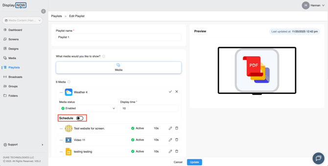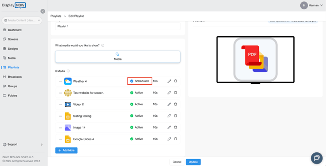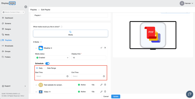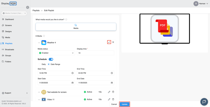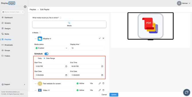 You can now schedule content within your playlists for specific dates and times. The Playlist Scheduling feature lets you assign multiple media items to play at different times throughout the day. Once a scheduled time period ends, the content automatically goes offline and stops displaying on your screen, giving you full control over when each item appears.