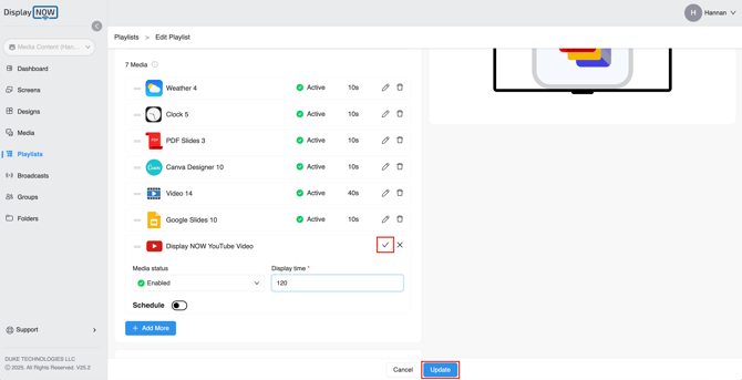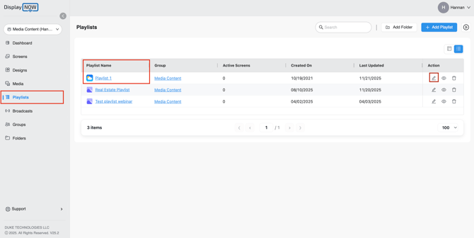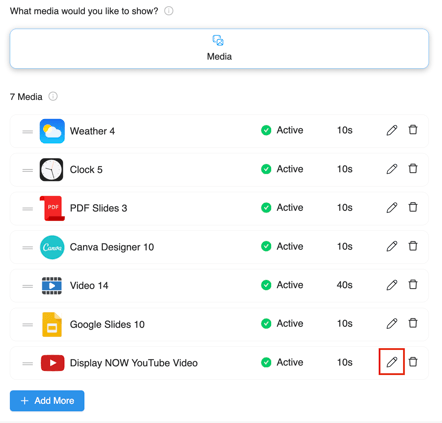 - Once you have added your YouTube video to your playlist, click on the "edit" button to add the number of seconds you would like the video to appear on screen