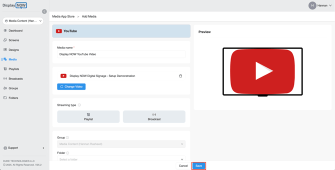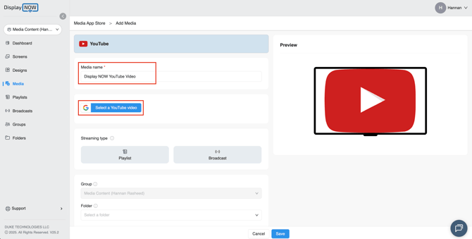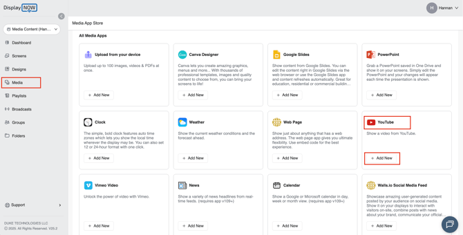 Step 1: Navigate to Display NOW Manager > Media App Store > YouTube.