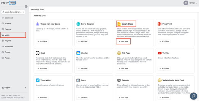Step 1: Navigate to Display NOW Manager > Media App Store > Google Slides