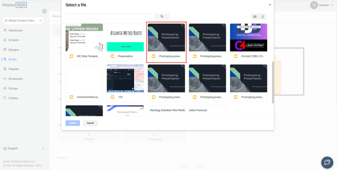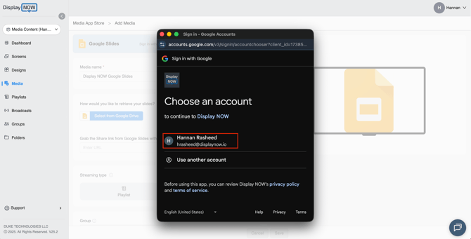 - Once you have signed into your Google Account, Display NOW will show all the slides you have created so you can choose whichever one you want to display on your screen.