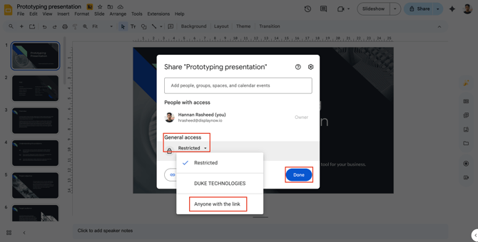 - Once you click on share, this pop up will appear. Please change your "General access" settings to "Anyone with the link" and then click on "Done." This will allow you to share your content on your TV screen without signing a sign in option again.