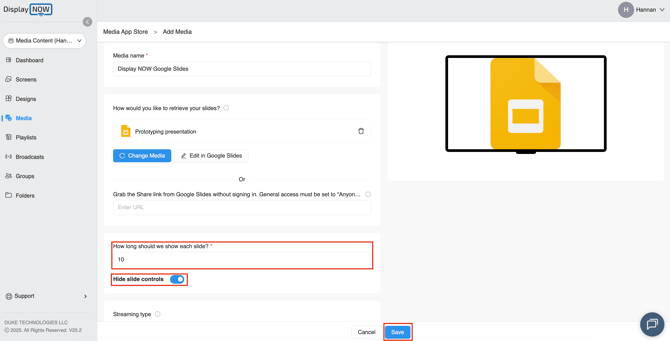- To ensure each slide displays for 10 seconds, you’ll need to calculate and enter the total duration of your Google Slide deck.