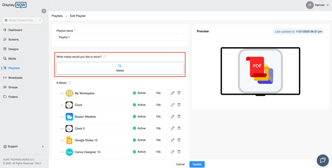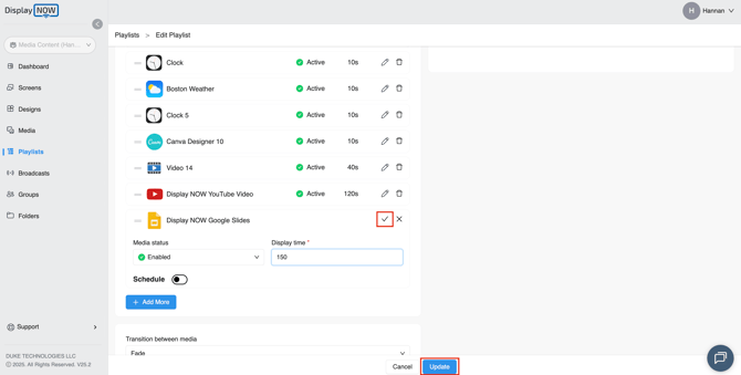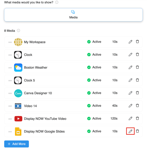 - Once you have added your Google Slides media to your playlist, click on the "edit" button to add the number of seconds you would like the video to appear on screen